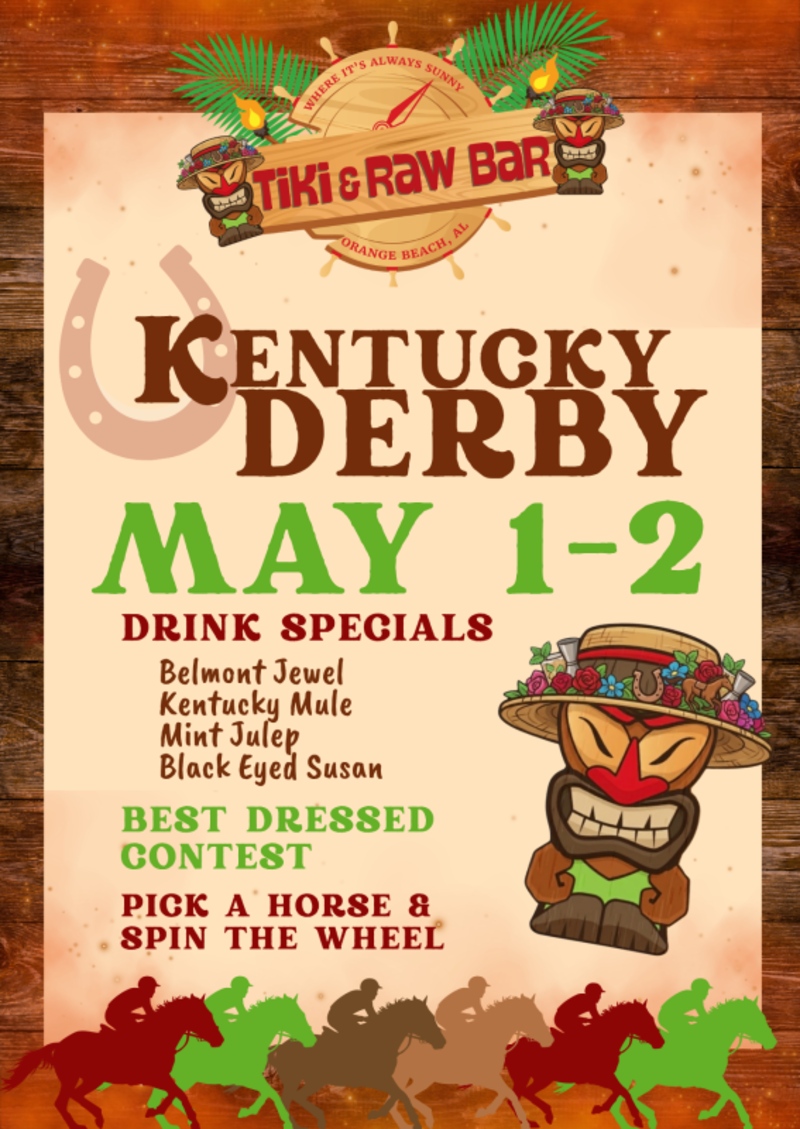 Get ready for a weekend full of big hats, cold drinks, and Derby Day fun at Tiki & Raw Bar. Join us May 12 as we celebrate the Kentucky Derby with specialty cocktails, games, and a little friendly competition.