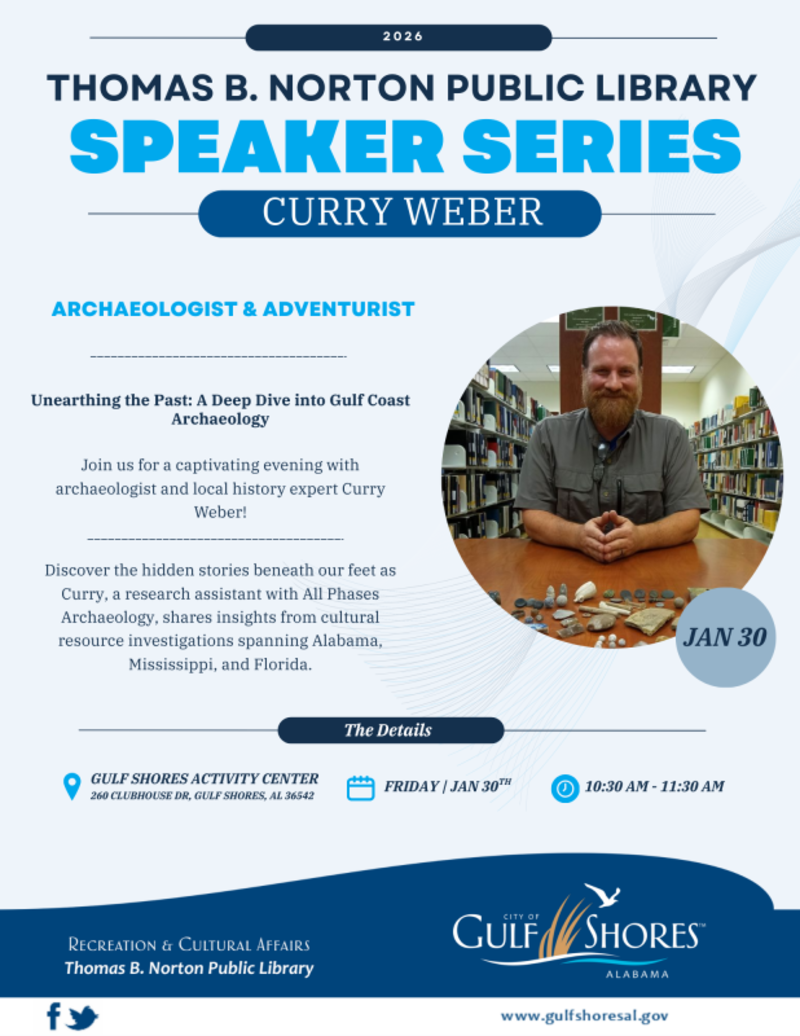 Mark your calendar for Friday, January 30, from 10:30 AM to 11:30 AM at the Gulf Shores Activity Center.