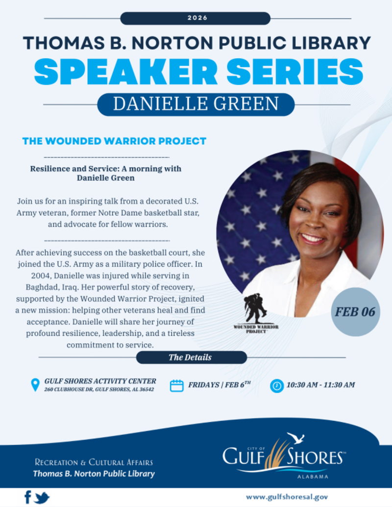 Get ready for a powerful and inspiring morning! The Thomas B. Norton Public Library's speaker series is featuring an incredible guest: Danielle Green, a decorated U.S. Army veteran and former Notre Dame basketball star! Danielle will share her powerful story of resilience, recovery, and service, highlighting her work with the Wounded Warrior Project.