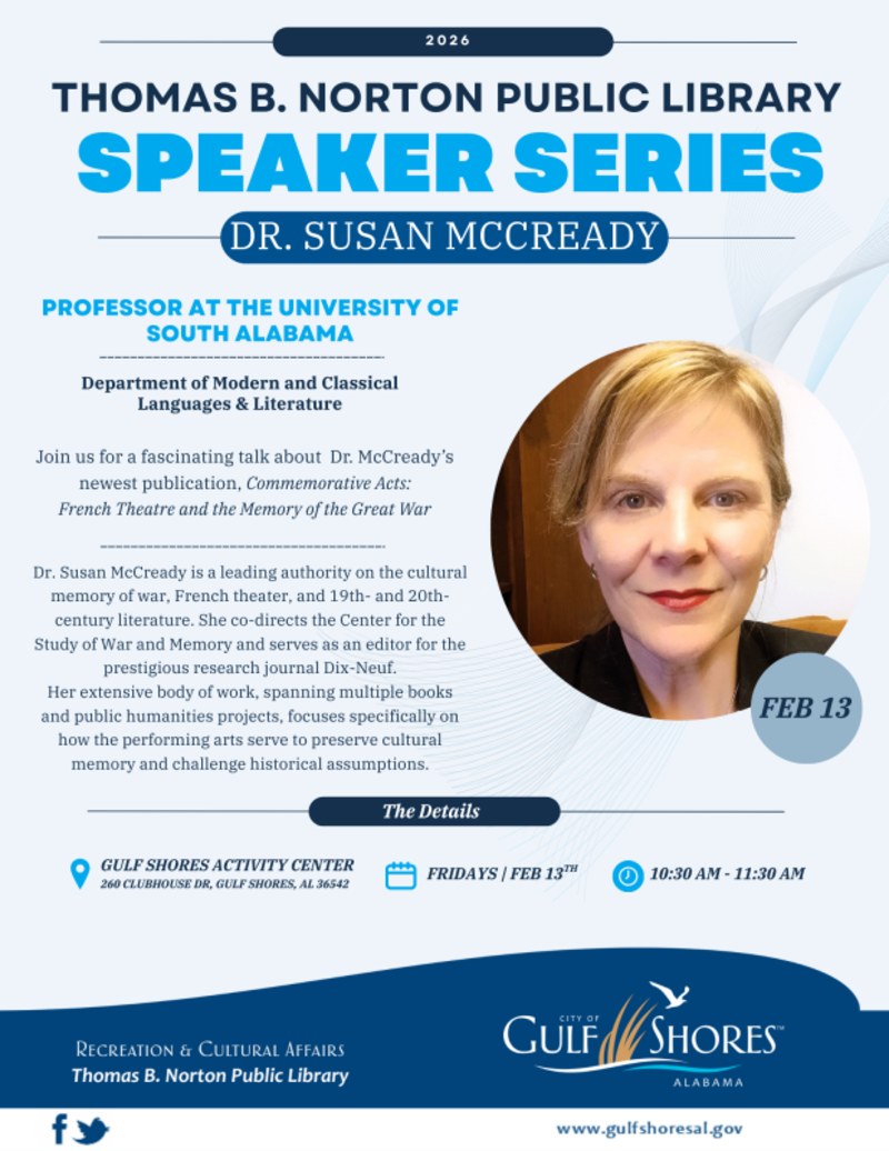 Get ready for a fascinating dive into history and memory! The Thomas B. Norton Public Library's speaker series is excited to host Dr. Susan McCready, a professor at the University of South Alabama and a leading authority on the cultural memory of war and French literature. Dr. McCready will be discussing her newest publication, Commemorative Acts: French Theatre and the Memory of the Great War.