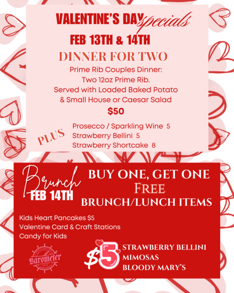 Join us Feb 13 & 14 for a waterfront Prime Rib Couples Dinner two 12oz prime ribs, a loaded baked potato, and your choice of house or Caesar salad for $50.
