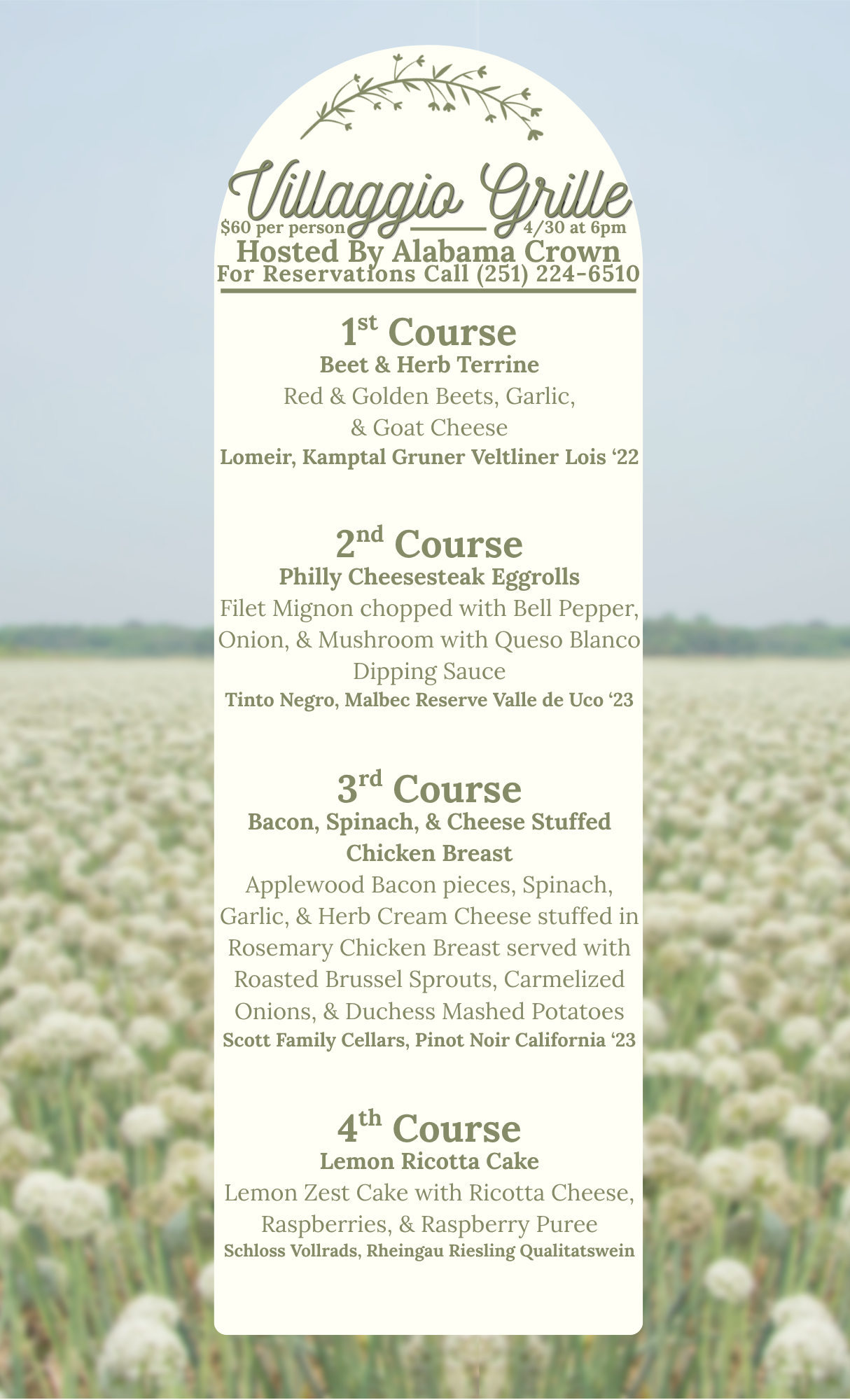 Call to reserve your table. 251.224.6510