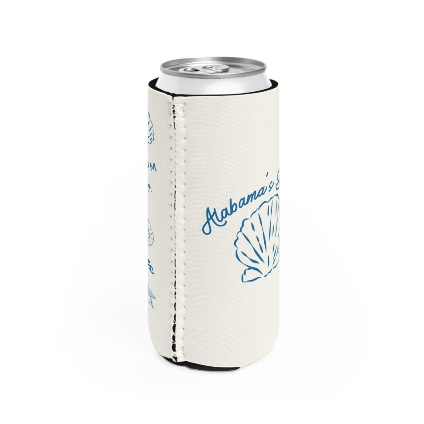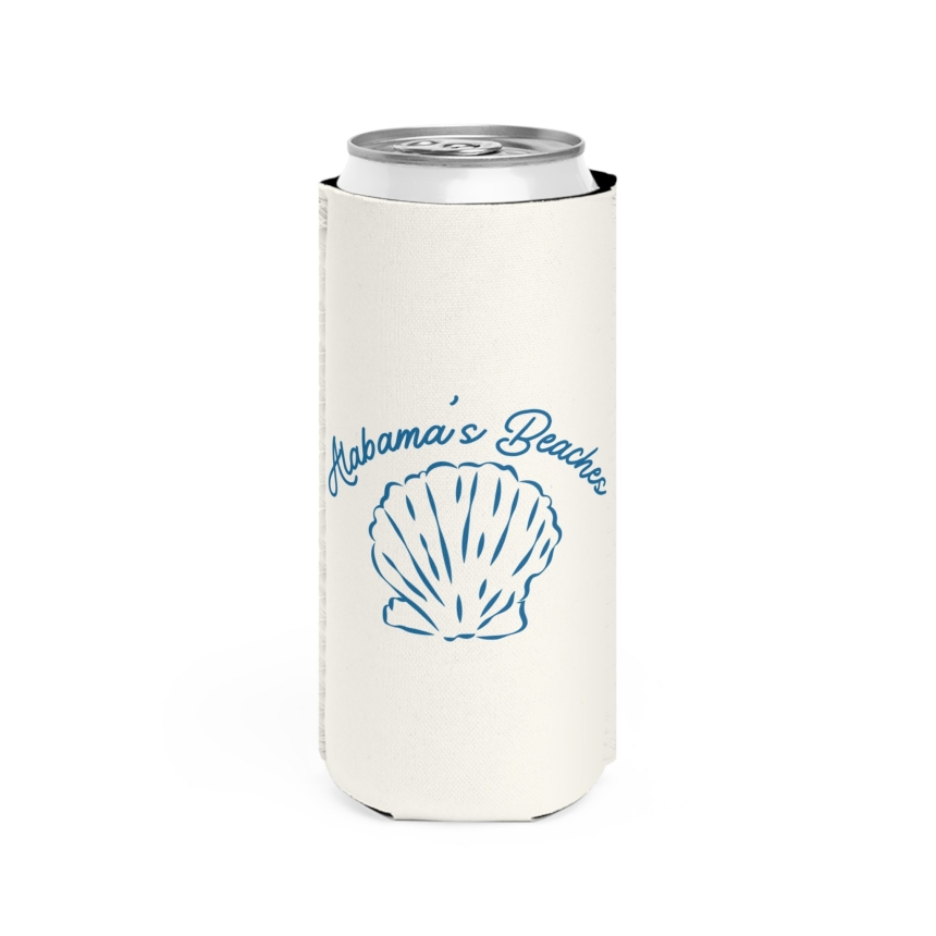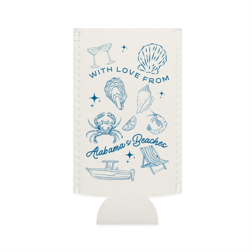 Meet your new beach-day essential: the With Love Slim Can Cooler. Designed to slip effortlessly over your favorite 12oz slim cans, this lightweight neoprene sleeve keeps drinks cold and hands dry while you soak up the good stuff. The soft coastal blue artwork feels like a postcard from the shore, mixing seashells, oysters, a crab, a beach chair, and a little boat for that just-left-the-dock energy. Finished with the hand-lettered phrase “With Love from Alabama’s Beaches,” it’s a small but thoughtful nod to slow afternoons, salty air, and seaside sips shared with friends.Easy to pack, easy to love, and always ready for a dockside picnic, beach bonfire, or backyard happy hour that could really use a coastal breeze.