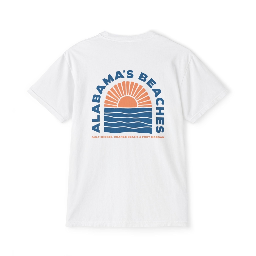 Bring the beauty of the Gulf Coast wherever you go with the Alabama’s Beach Sunrise Tee. Inspired by peaceful mornings on Alabama’s Beaches, this unisex pocket tee features a vintage-style sunrise graphic representing Gulf Shores, Orange Beach, and Fort Morgan. Crafted from ultra-soft, garment-dyed, ring-spun cotton, it delivers all-day comfort with a lived-in feel you’ll reach for again and again.